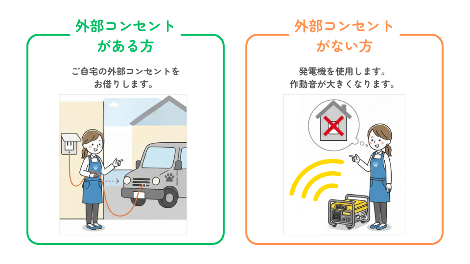 スムーズなトリミングを行なうために、事前に駐車場所と電源の確認をお願いしております。
